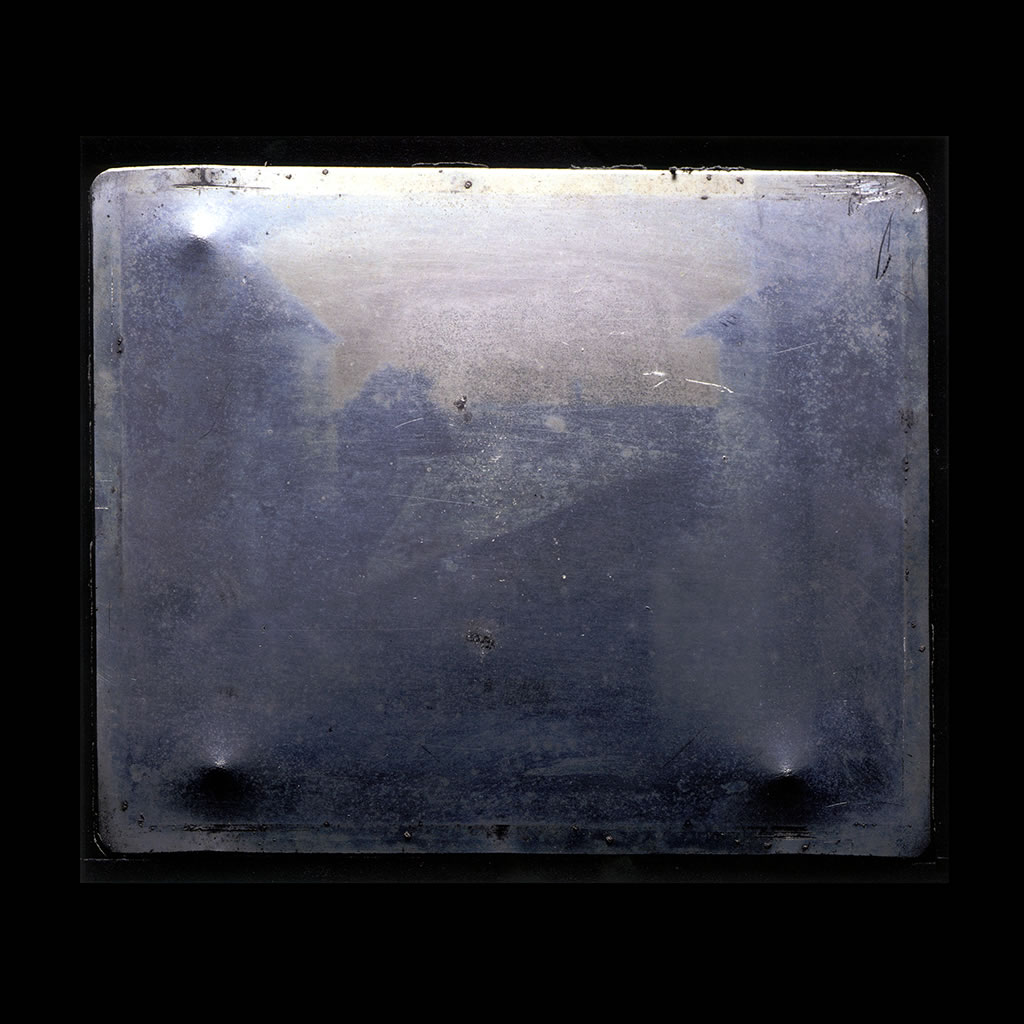 Figure 1: Considered the first modern photograph, the heliograph "Point de vue du Gras" was taken by J. N. Niépce probably in 1827 using Judea bitumen. It made use of the propensity of bitumen to age upon light exposure. It is conserved at the Harry Ransom Center of the University of Austin (Texas, USA). Full reference of original picture is: Joseph Nicéphore Niépce (French, 1765–1833), Untitled 'point de vue,' 1827. Heliograph on pewter, 16.7 x 20.3 x .15 cm. Gernsheim Collection, purchase, 964:0000:0001. Picture courtesy of HRC: https://www.hrc.utexas.edu/niepce-heliograph/