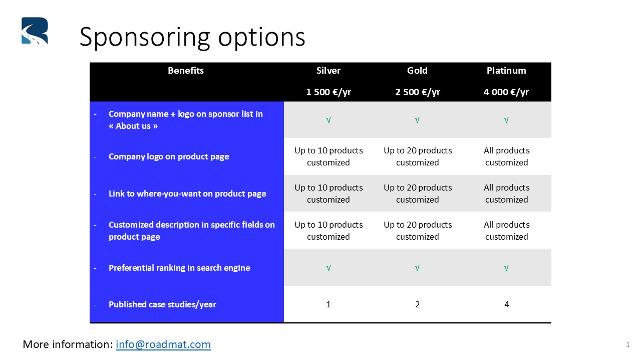 Nos options de sponsoring sont présentées ci-dessous. Si vous voulez en savoir plus et pensez à rejoindre nos autres sponsors, n'hésitez pas à nous contacter (info@roadmat.com).